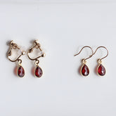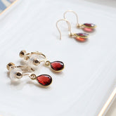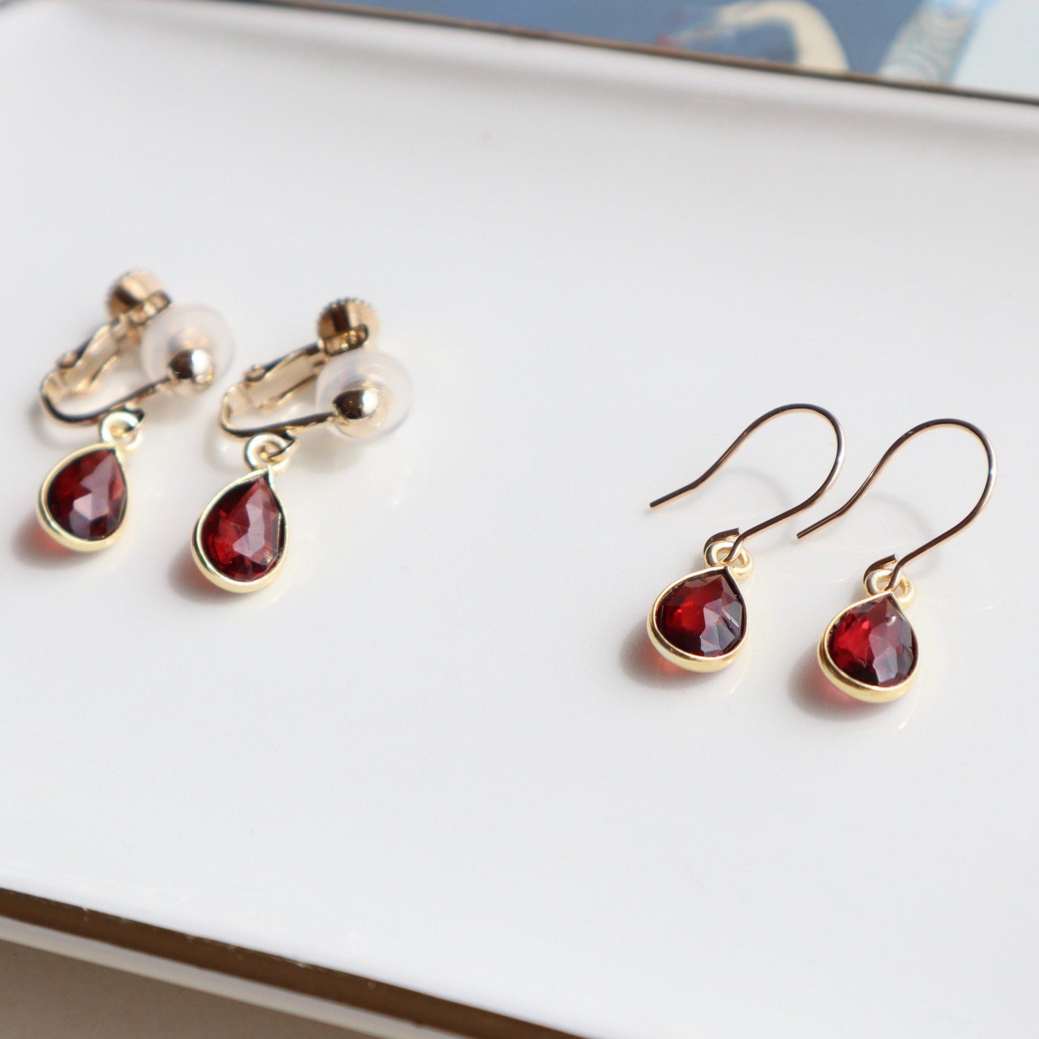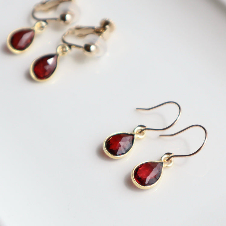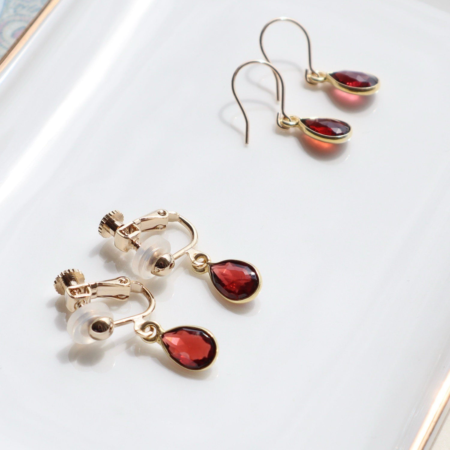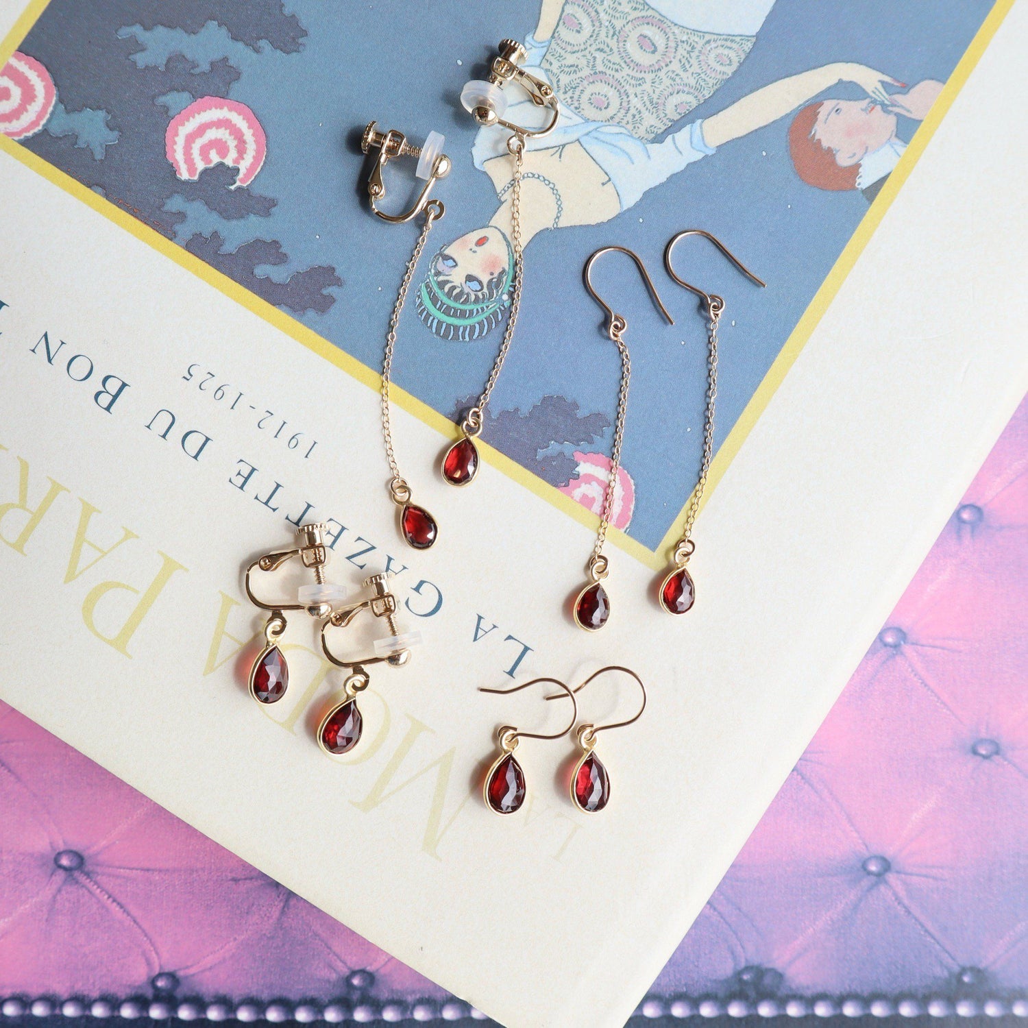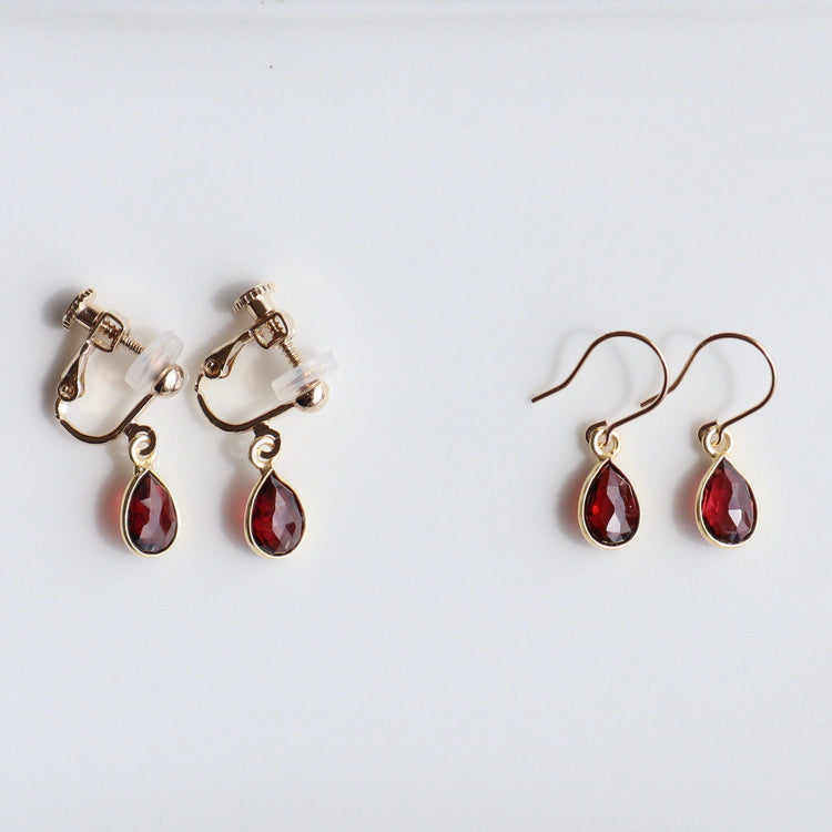 Material: 14KGF (Pierced earrings hook and chain), GP on brass (Clip-on earrings hardware), K18GP on Silver925 stone frame, garnet