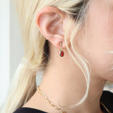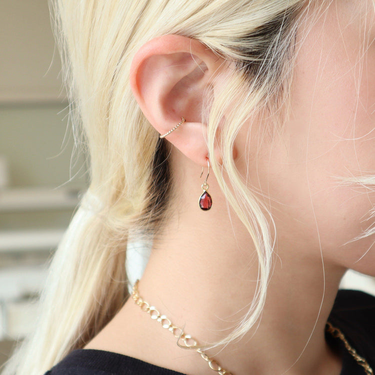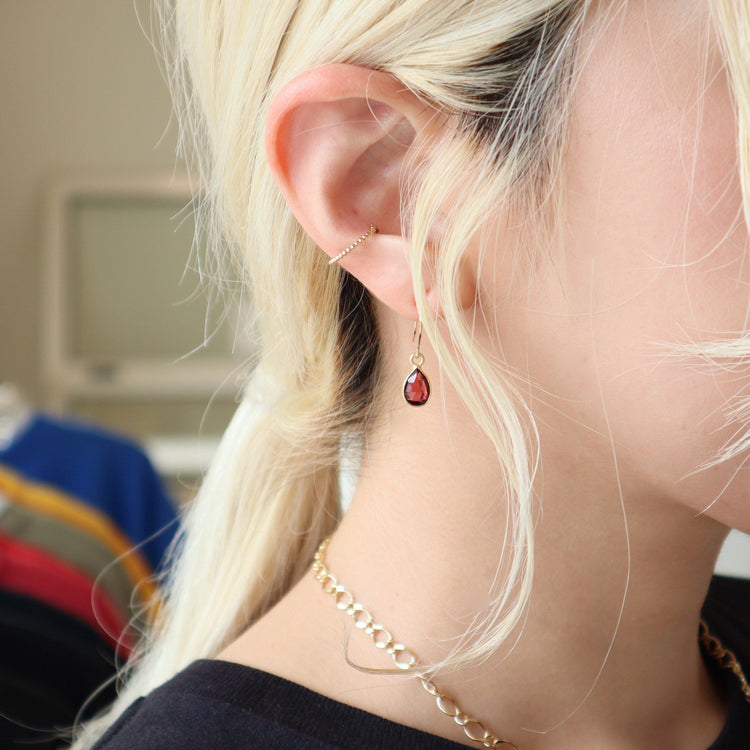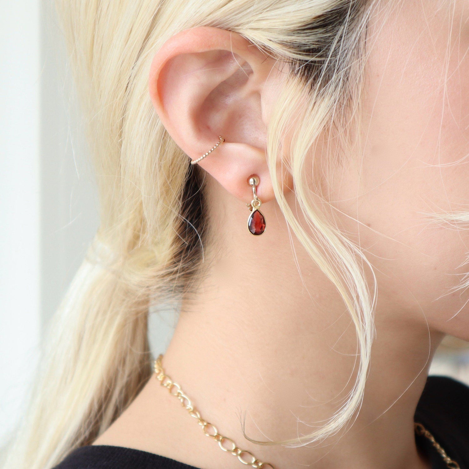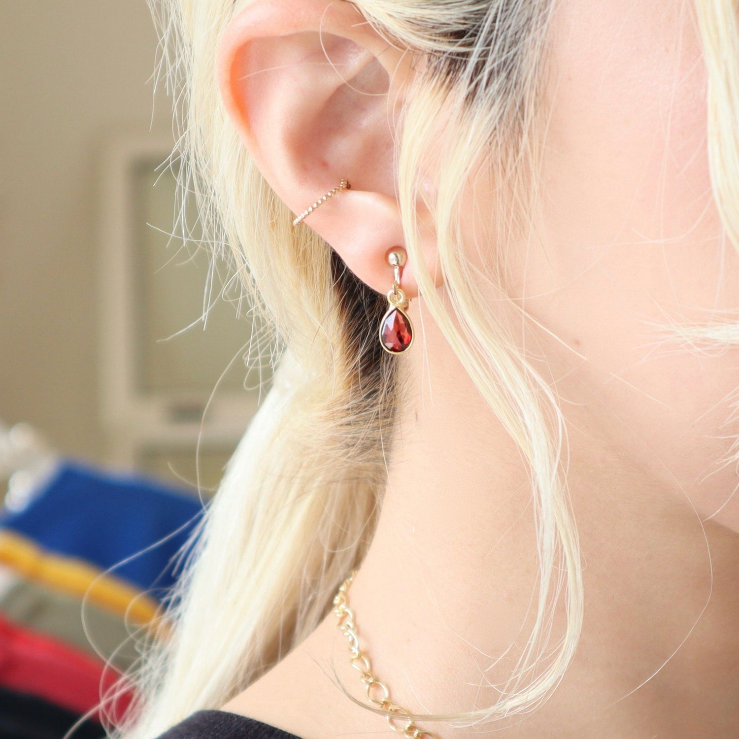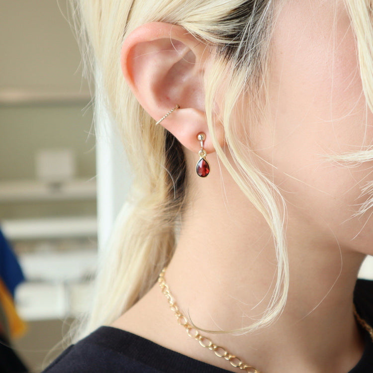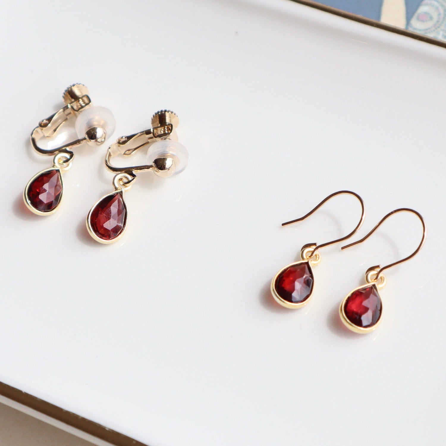 Material: 14KGF (Pierced earrings hook and chain), GP on brass (Clip-on earrings hardware), K18GP on Silver925 stone frame, garnet