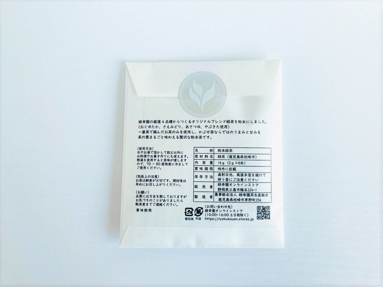 The powder is made from an original blend of four varieties (Okuyutaka, Saemidori, Asatsuyu, and Yabukita) carefully selected by Ryokkoen, using only this year's new tea.