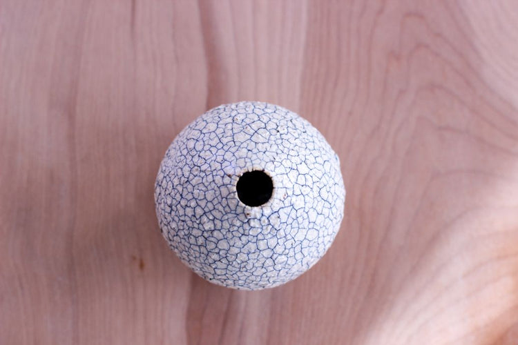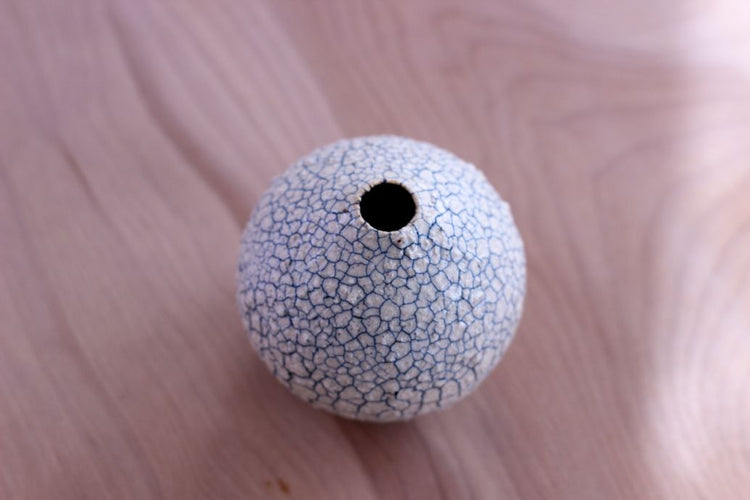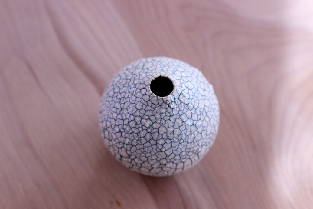 This egg-shaped vase seems to envelop you with warmth the moment you hold it in your hand. This expressive single-flower vase has a white background with a blue crack pattern. Its small presence will decorate any room, regardless of where it is placed.