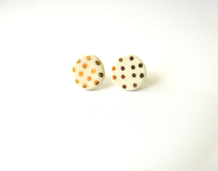 Pierced earrings/Clip-on earrings in gilt dot patterned pottery.