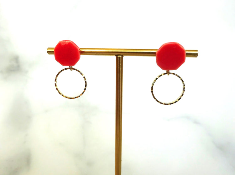 Octagonal and gold ring ceramic pierced earrings / Clip-on earrings (red)
