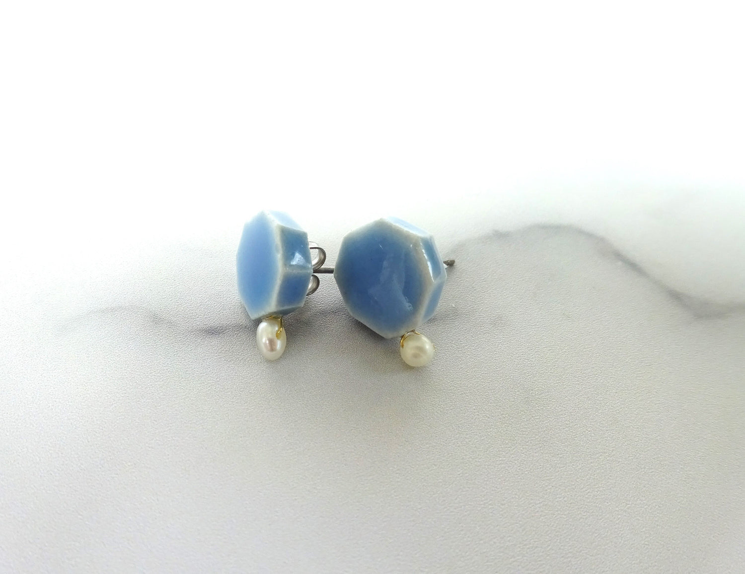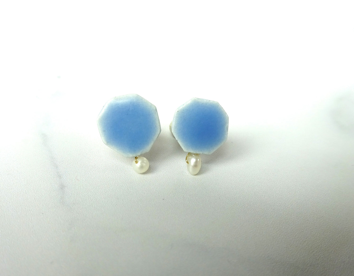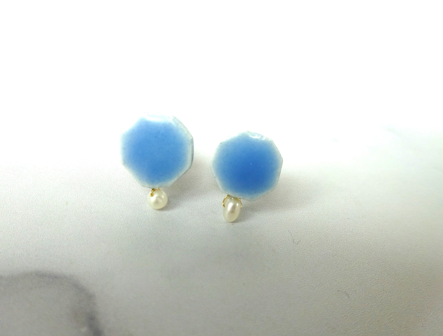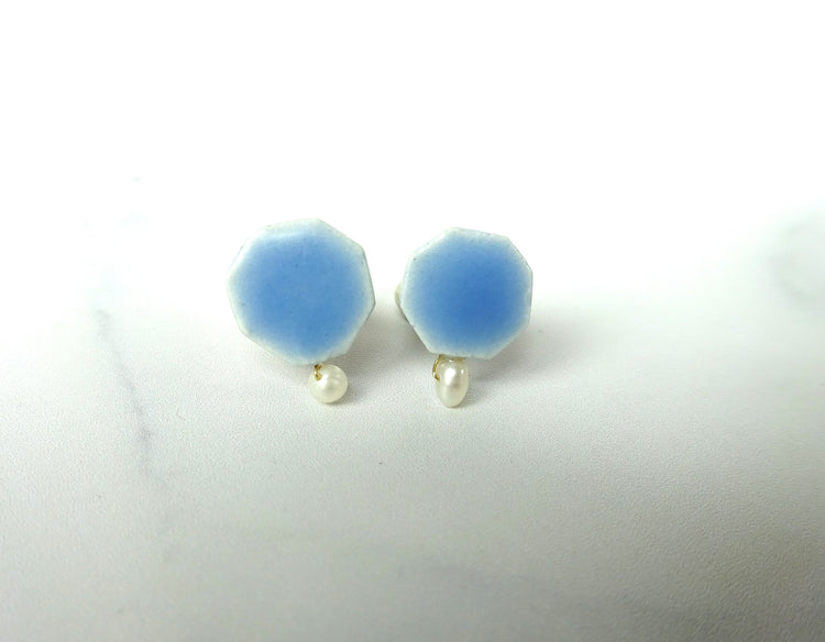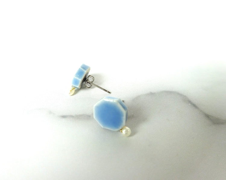 Small octagonal and small freshwater pearl ceramic pierce/earring (light blue)