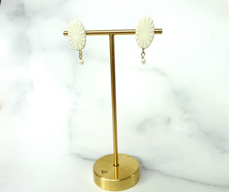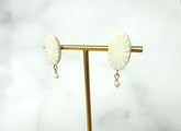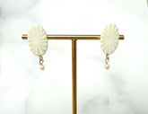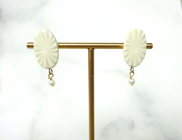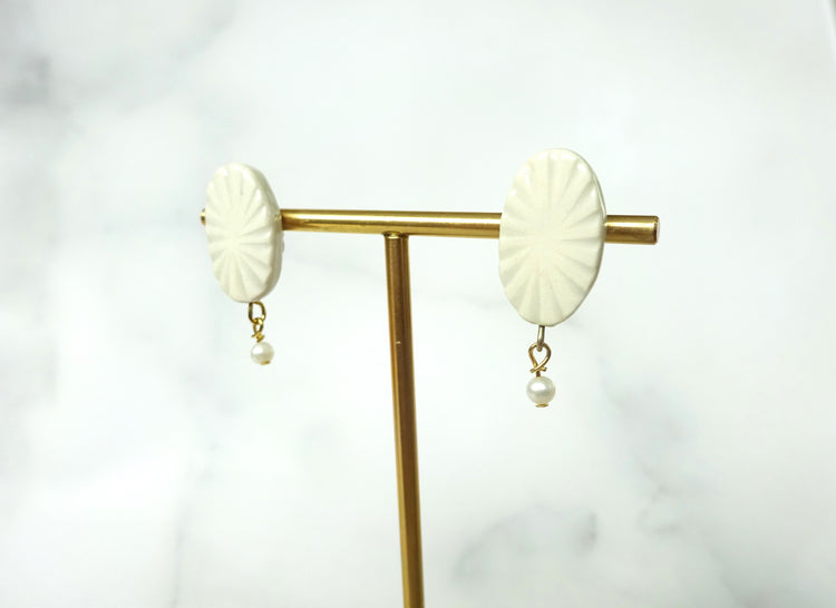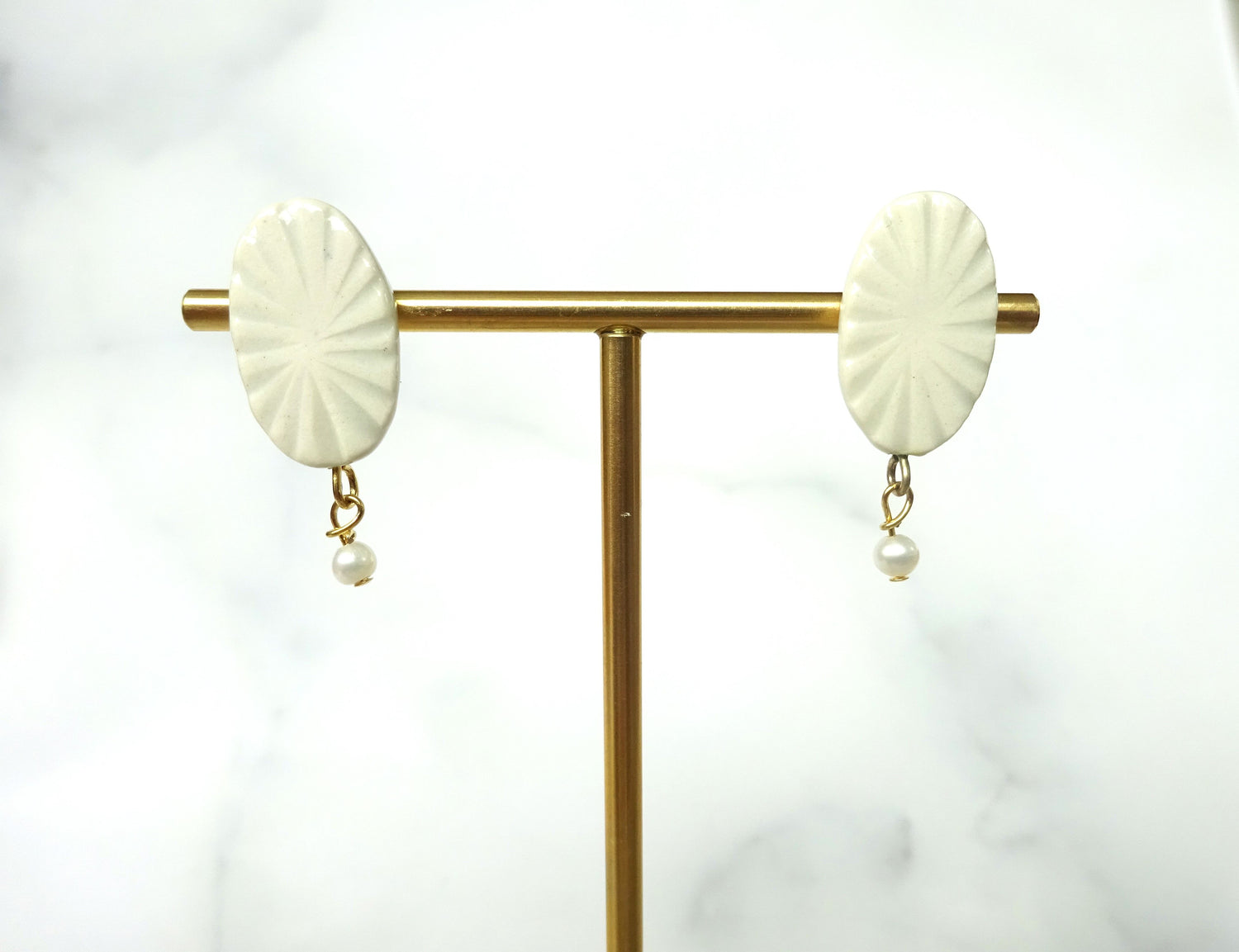 Pierced earrings/Clip-on earrings with a combination of finely cut ceramics and freshwater pearls.