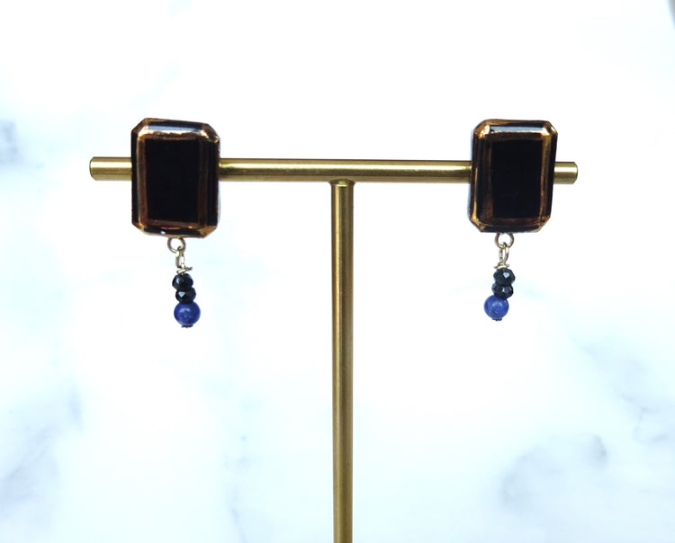 Clip-on earrings with sodalite and spinel shimmering on jewel cut pottery hand painted in gold.