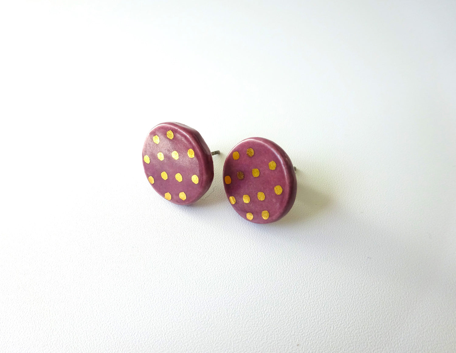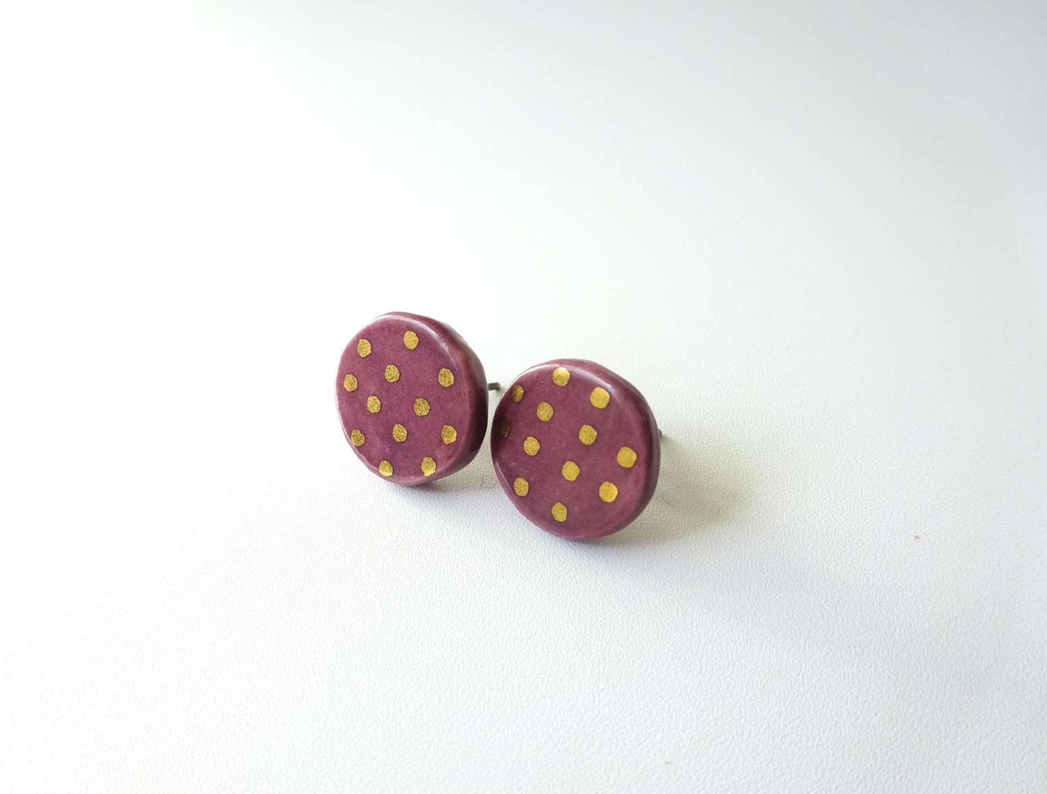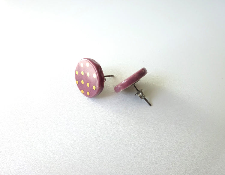 Pierced earrings/Clip-on earrings in gilt dot patterned pottery.