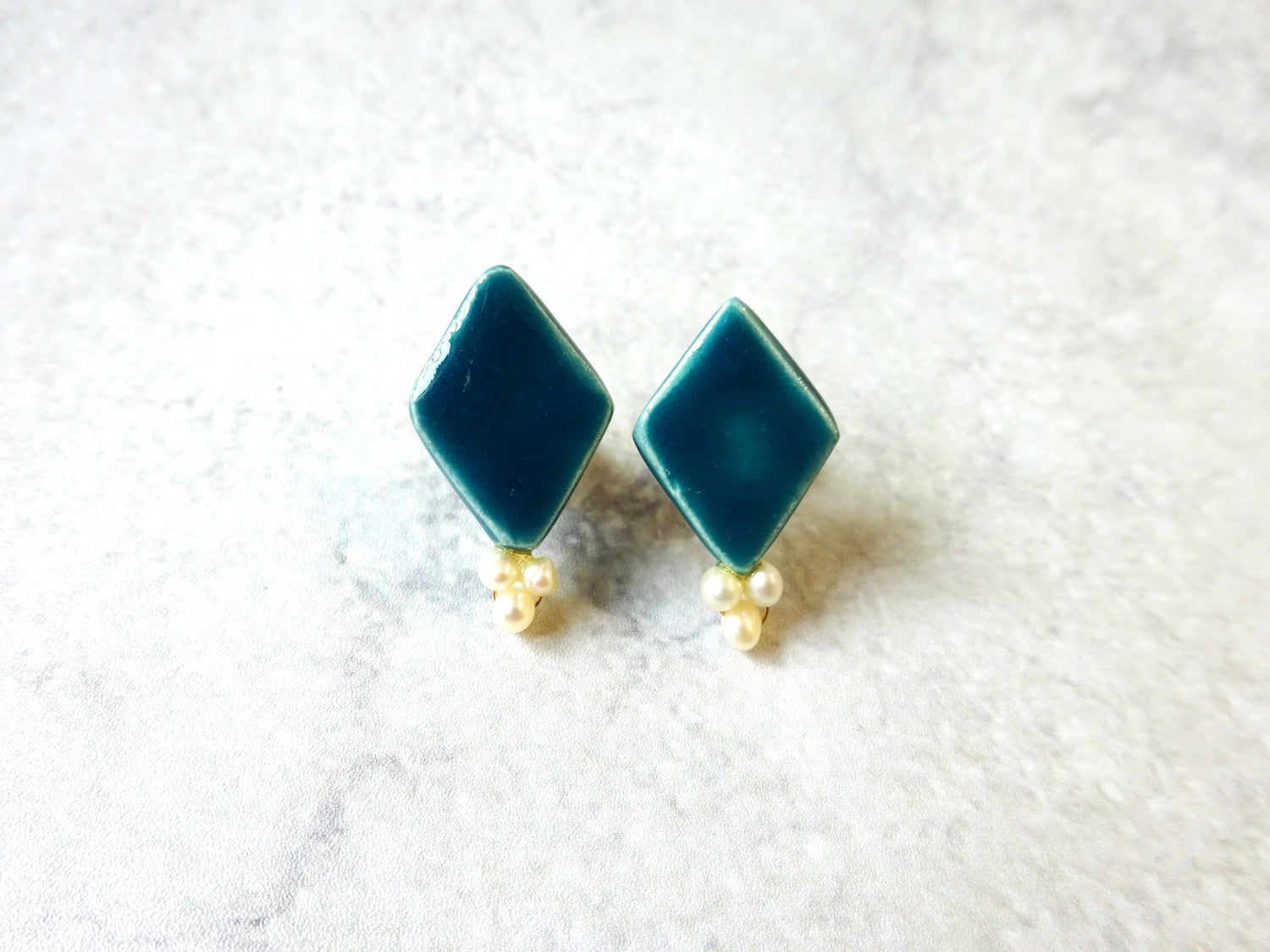 hishigata freshwater pearl pierced earrings/Clip-on earrings (dark green)