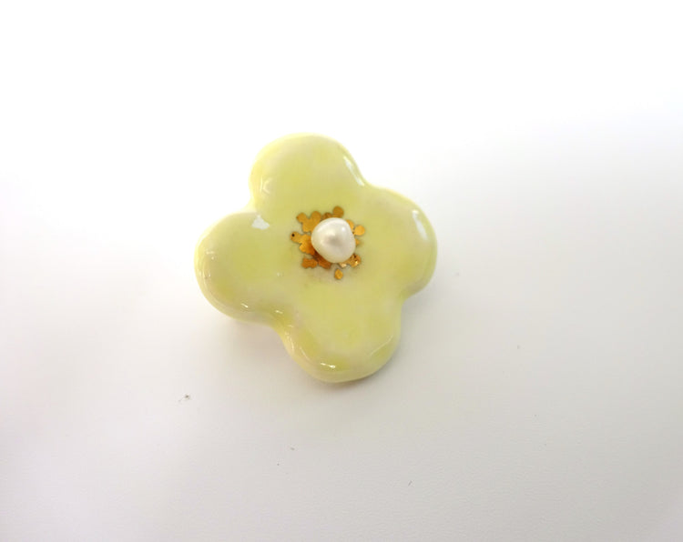 A small ceramic brooch with freshwater pearls at the core of the flower.