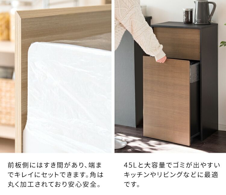 The push-door type prevents odors from leaking out and makes it easy to dispose of trash just by pushing the door. The dustbin is equipped with casters that allow you to quickly and easily move it to your hand, so you can take it out and pick it up right away when you are ready to dispose of the trash. Garbage bags can be easily attached and removed for convenience. With a capacity of 45 liters, it is comfortable even for a large family.