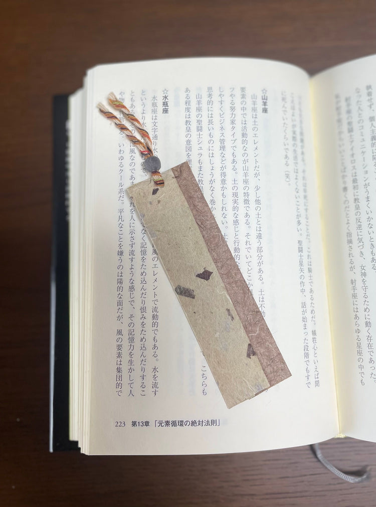 The bookmark is made of Japanese paper made of Yoshino cedar bark and dyed with olive, cherry, and other colors.