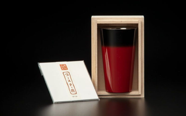 This cup has a stainless steel body finished with Tsubame-Sanjo polishing techniques and lacquered by Yamanaka Lacquerware, a traditional craft.