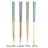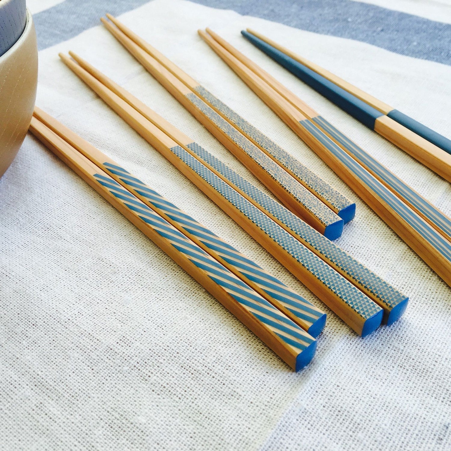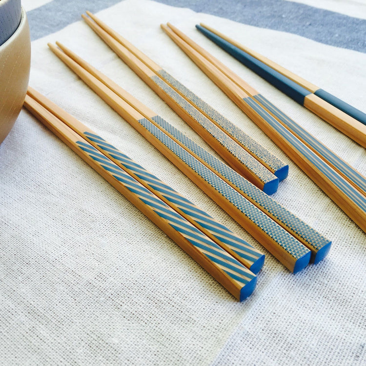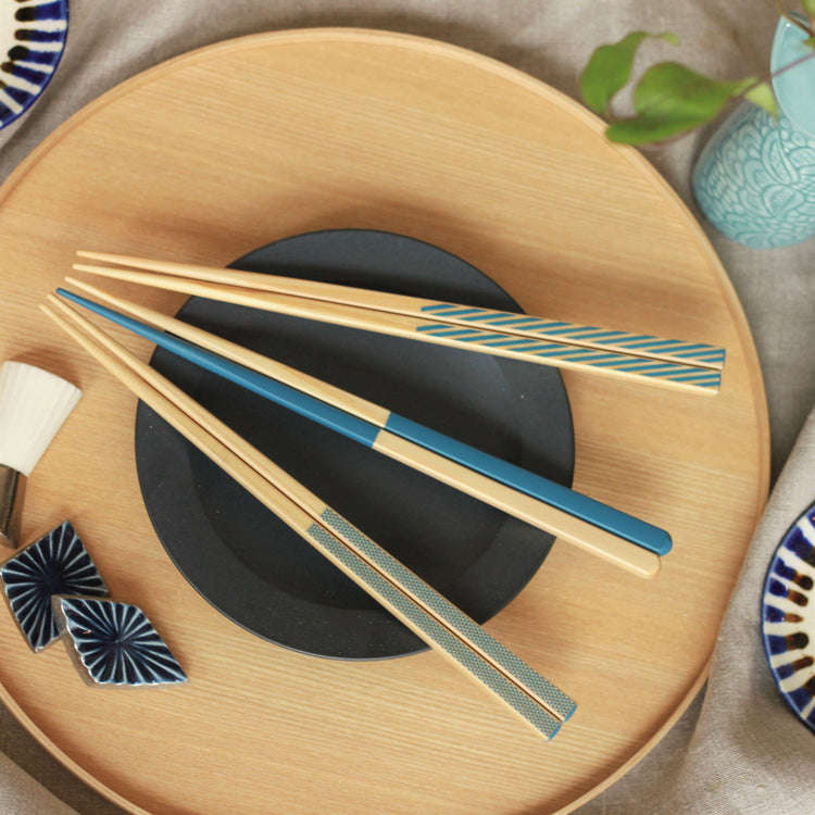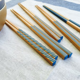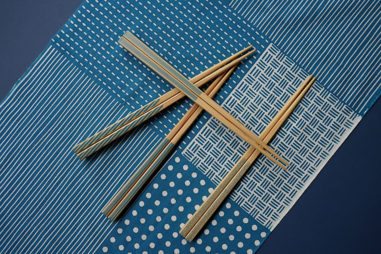 The BLUE chopsticks are decorated with a dark blue [shibori pattern], which was popular in the Edo period.