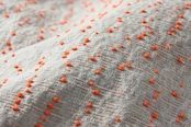It is made of a slightly thick light gray fabric with orange dots that are fun to the touch, a pop and cute jacquard weave fabric.