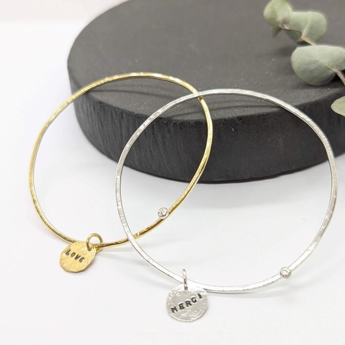 A silver motif resembling such an awkward and rounded pebble is placed on a gently curved part of the bangle.