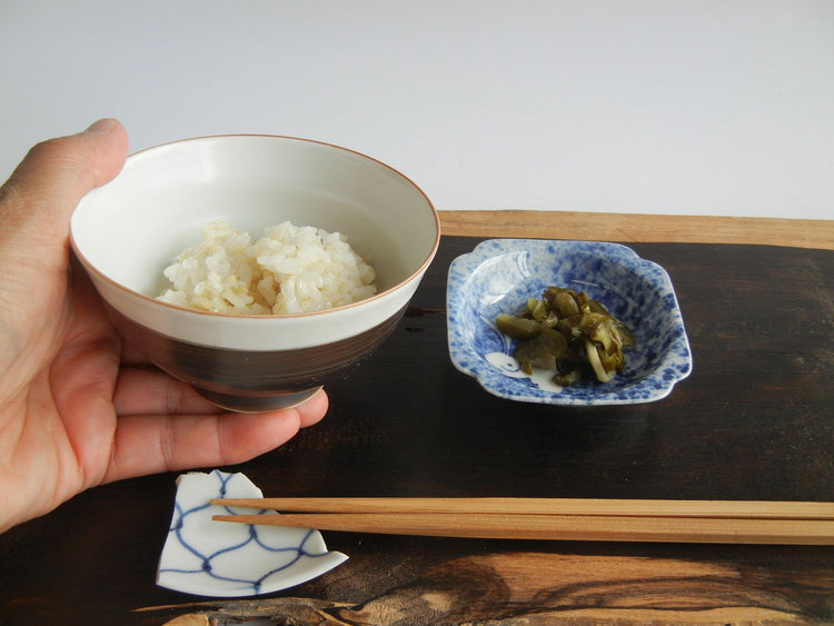 The inside and outside of the lip are glazed with matte white porcelain and painted with fuchi-beni (reddish-brown).