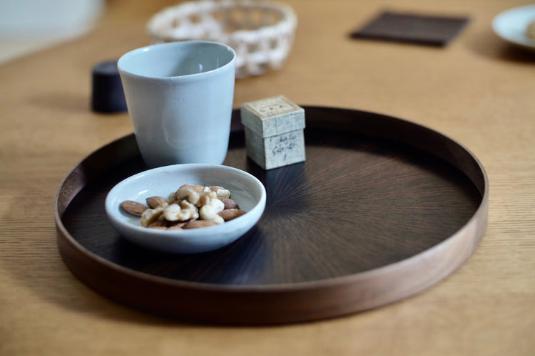 By laminating veneers cut at an acute angle around the center of the tray, the tray looks as if rays of light are coming from the center of the veneer.