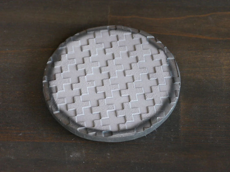 The circular coaster is decorated with a [mosaic] pattern.