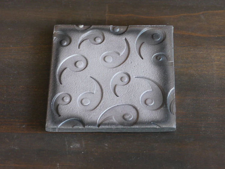 The square coaster is decorated with Tomoe Chirashi, a traditional Japanese pattern.