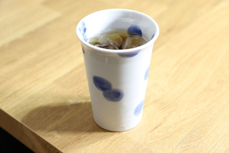 A tall cup for drinks with a polka dot pattern in blue. The polka dots in shades of blue became a cool pattern.