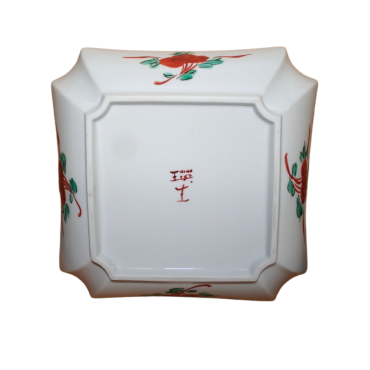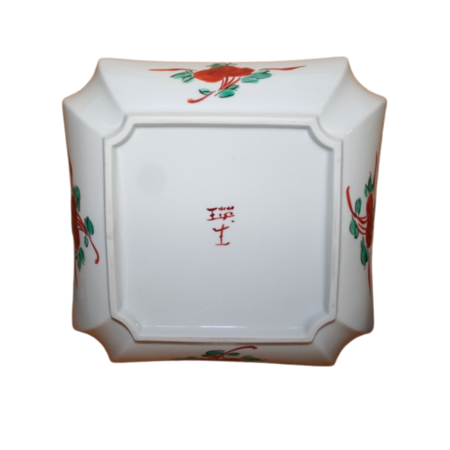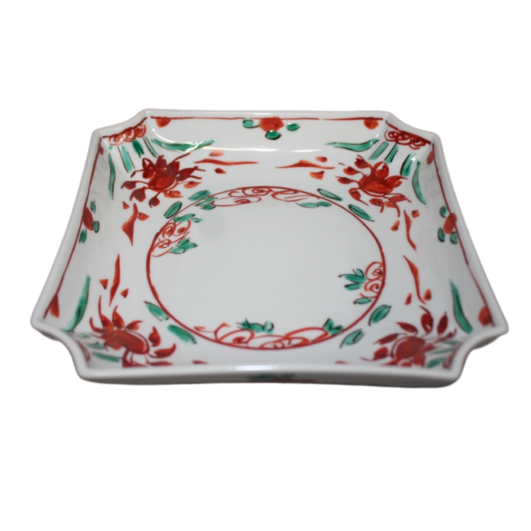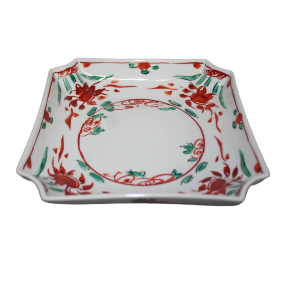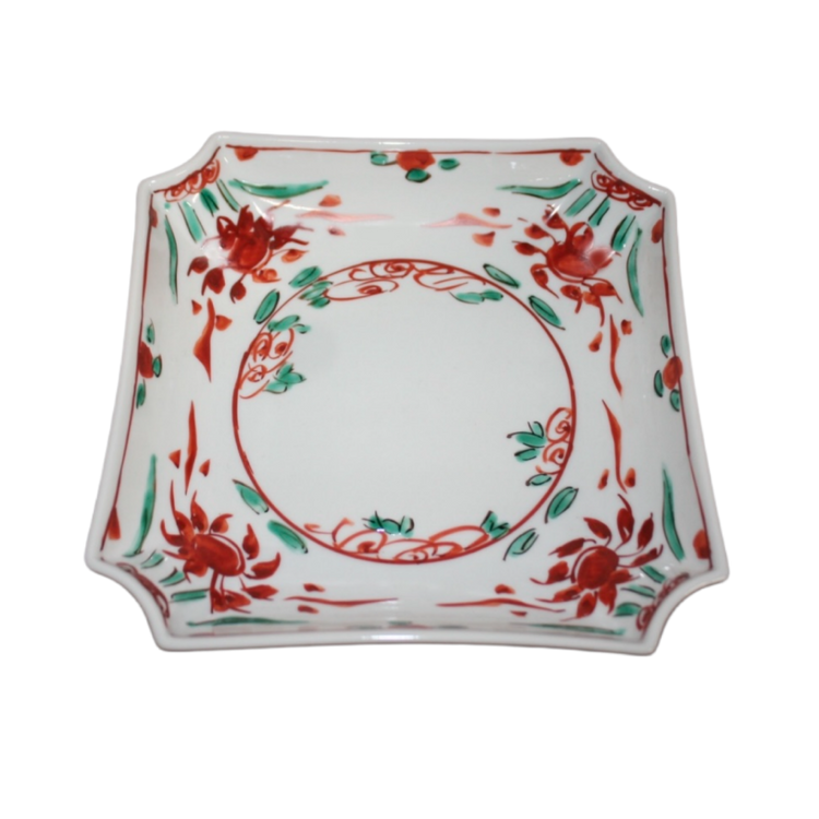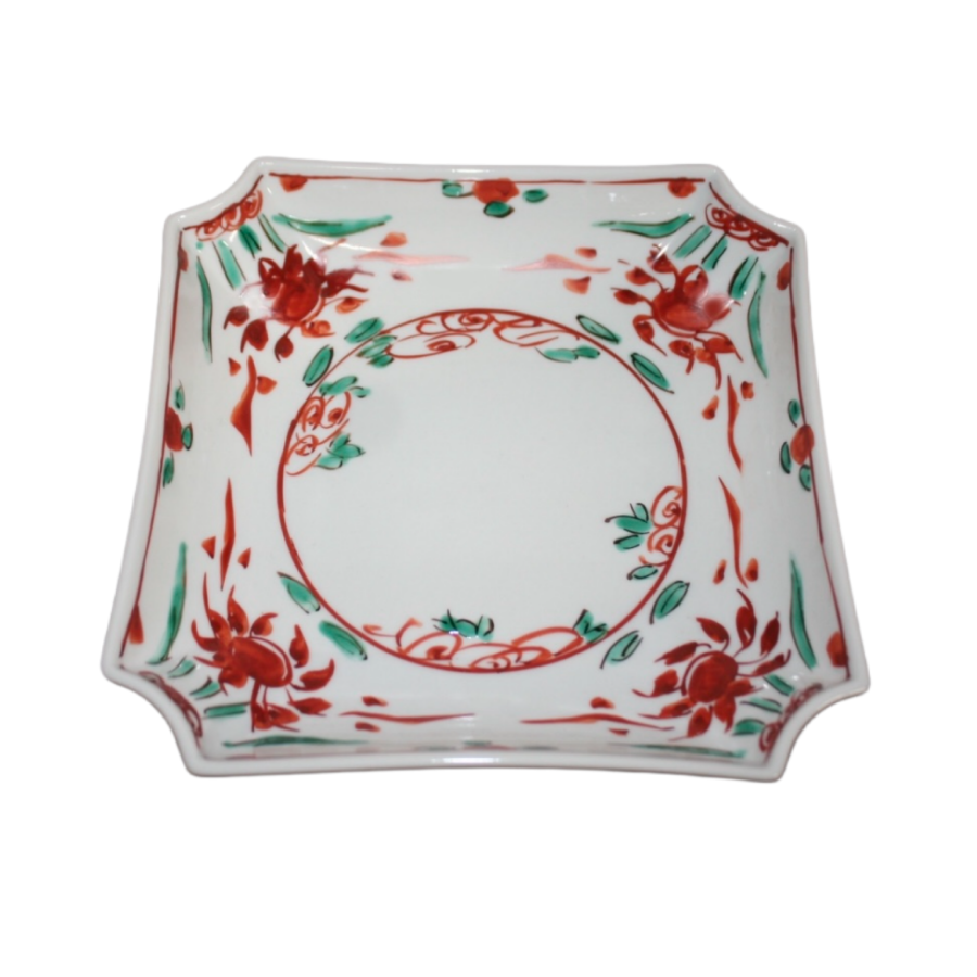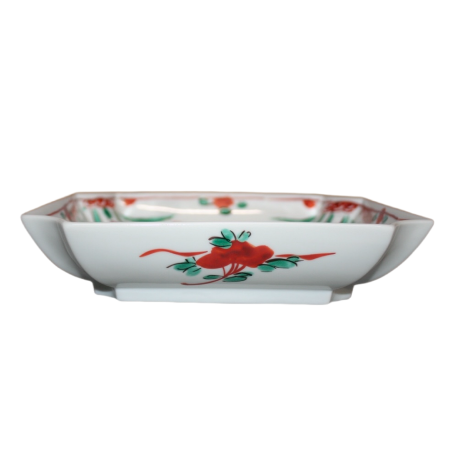 This is a Kutani-like square bowl with Kuresu red painting.