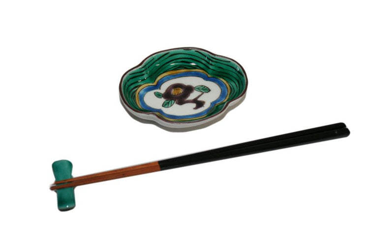 This 3" tsuba-shaped dish is painted in the Kogutani style. It is decorated with a camellia pattern in blue hand.