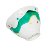 12.5 x 8.3 cm in diameter. This is one of our best-selling modern Kutaniyaki designs, featuring a Japanese yoroke pattern with skipped polka dots.