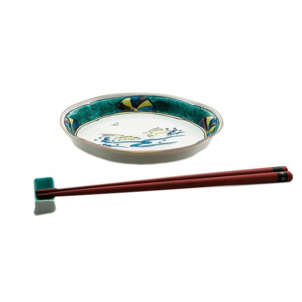 The shape of this dish was designed by Rosanjin, but Kutani Bitoen has combined the edge pattern and the rabbit in the center with an Old Kutani pattern.