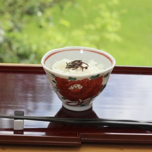 This is a rice bowl with a peony design made by Kutani Bitoen. We hand-painted a lot of large peonies on the bowl, which is typical of Rosanjin. There are people who say that this is their favorite among many bowls. This bowl is widely popular among young women and elderly men. The large peony, which is typical of Rosanjin, was painted by hand on the tea bowl.