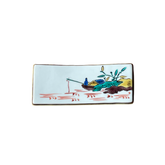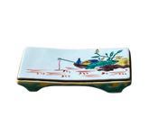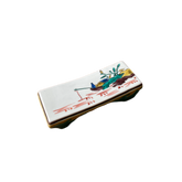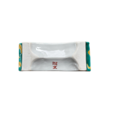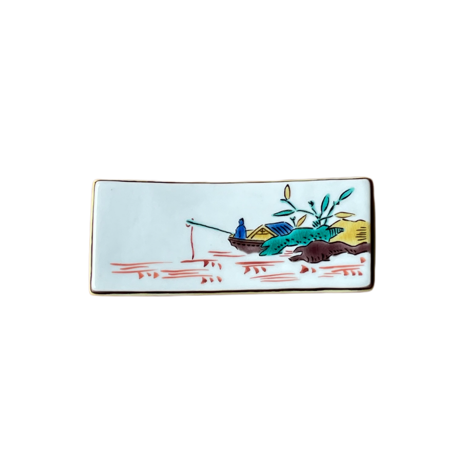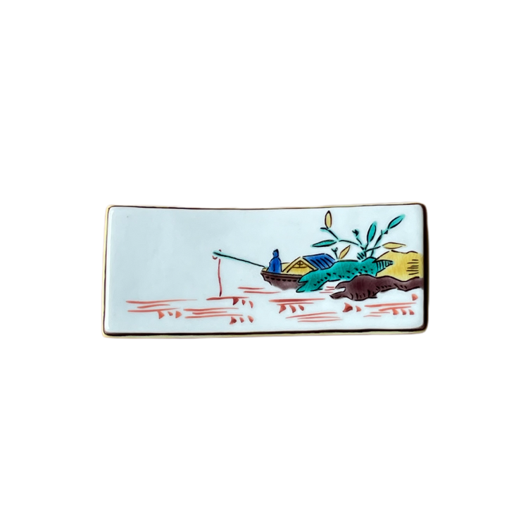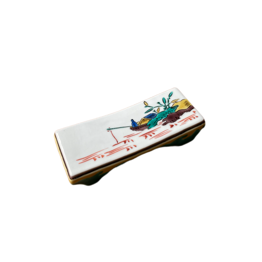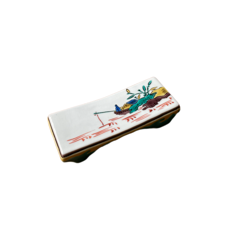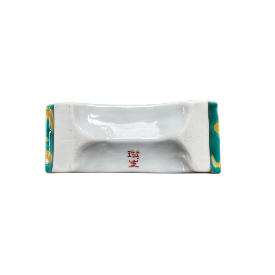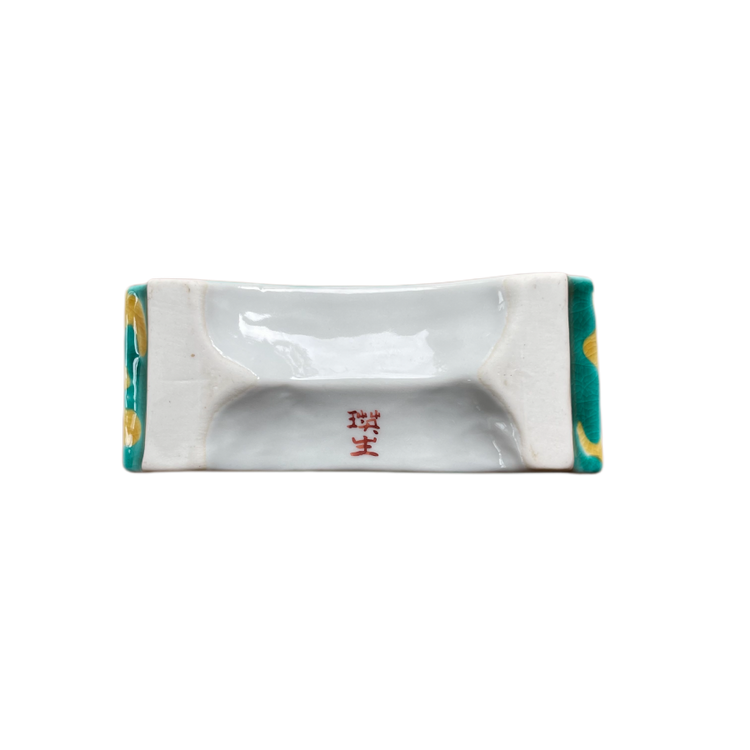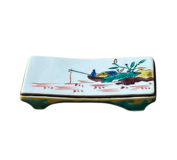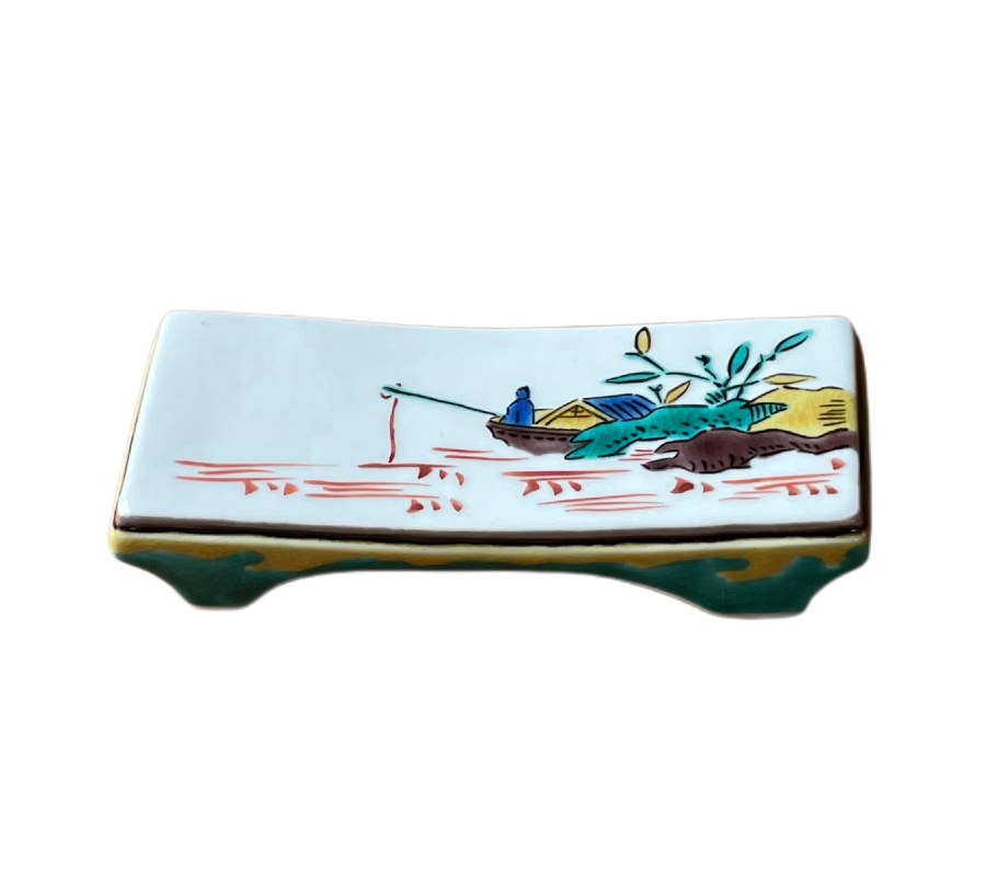 This is a Kutani-ware Bokusho, a calligraphy and painting utensil. It is a stand on which to place ink to be polished. It is hand-painted with Kutani Yaki's hand-entwined patterns.