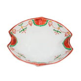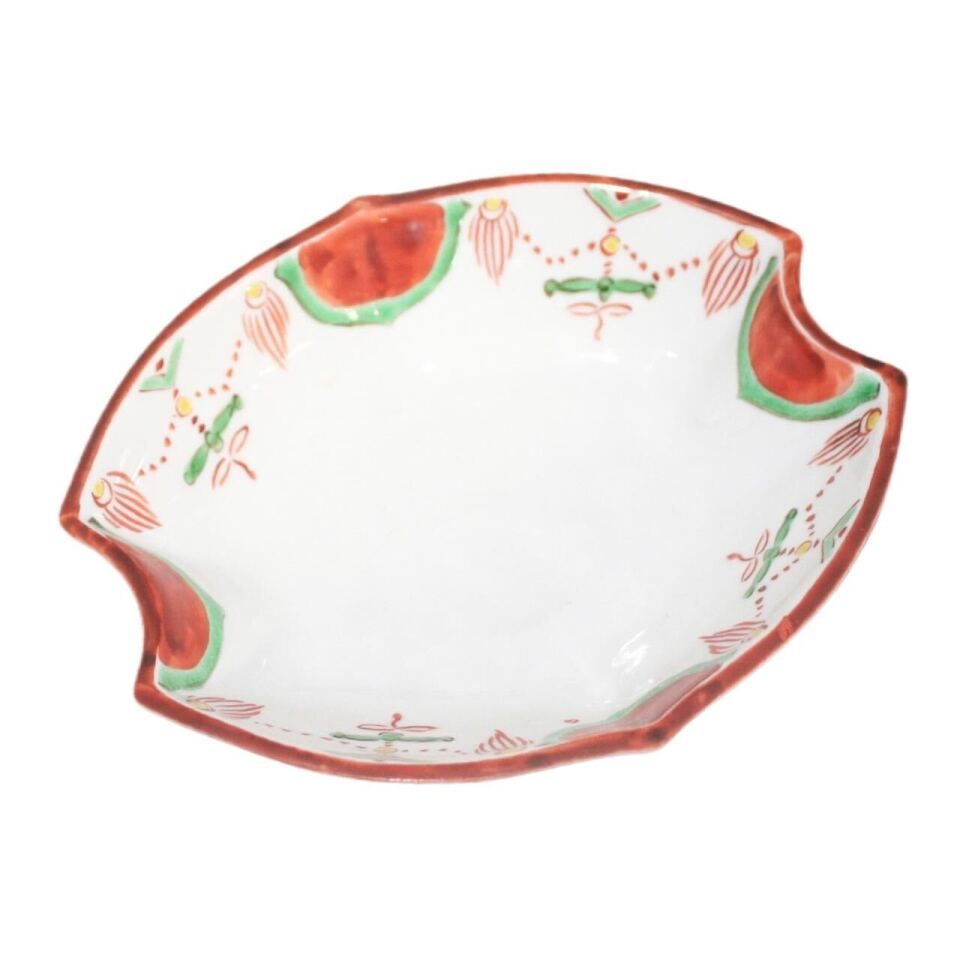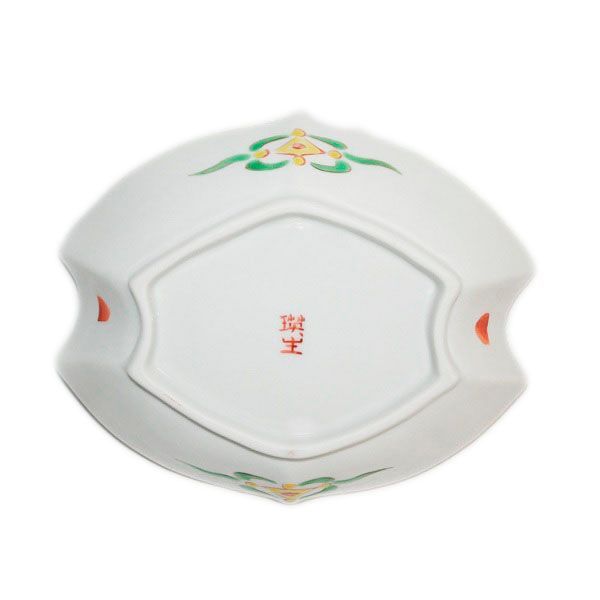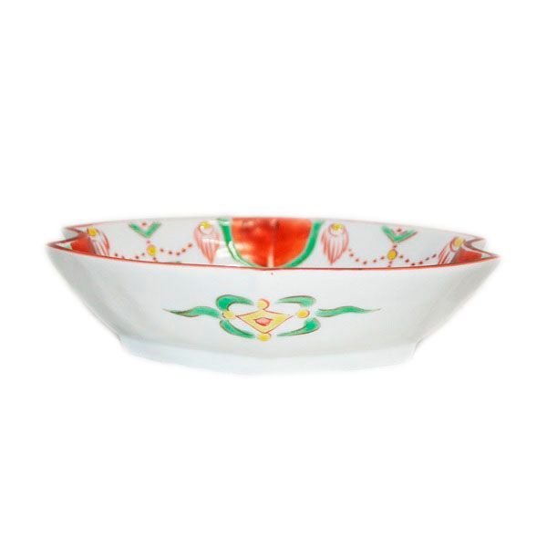 This mukozuke is decorated with a Yoraku pattern in red, with green and yellow as additional colors. It is a perfect dish for serving sashimi and other dishes.