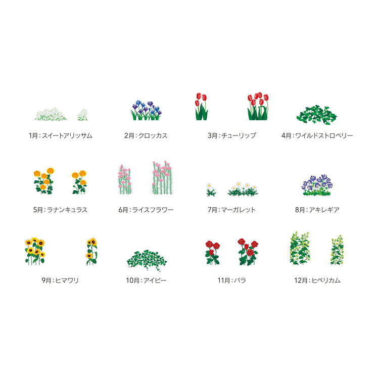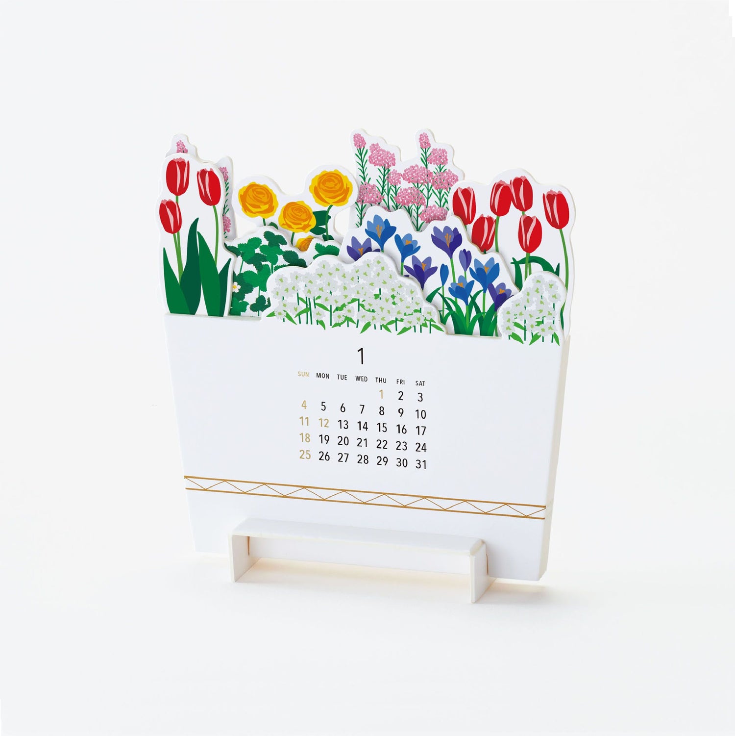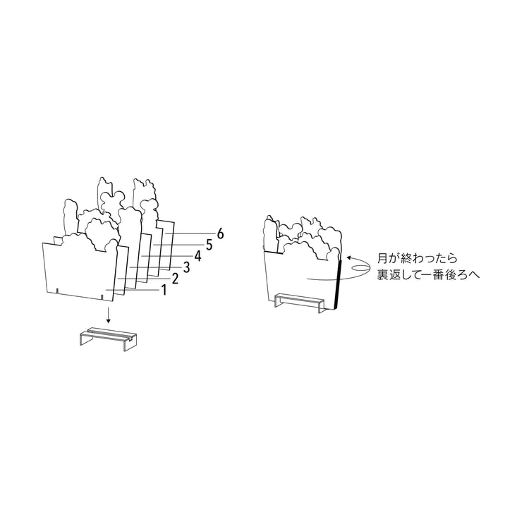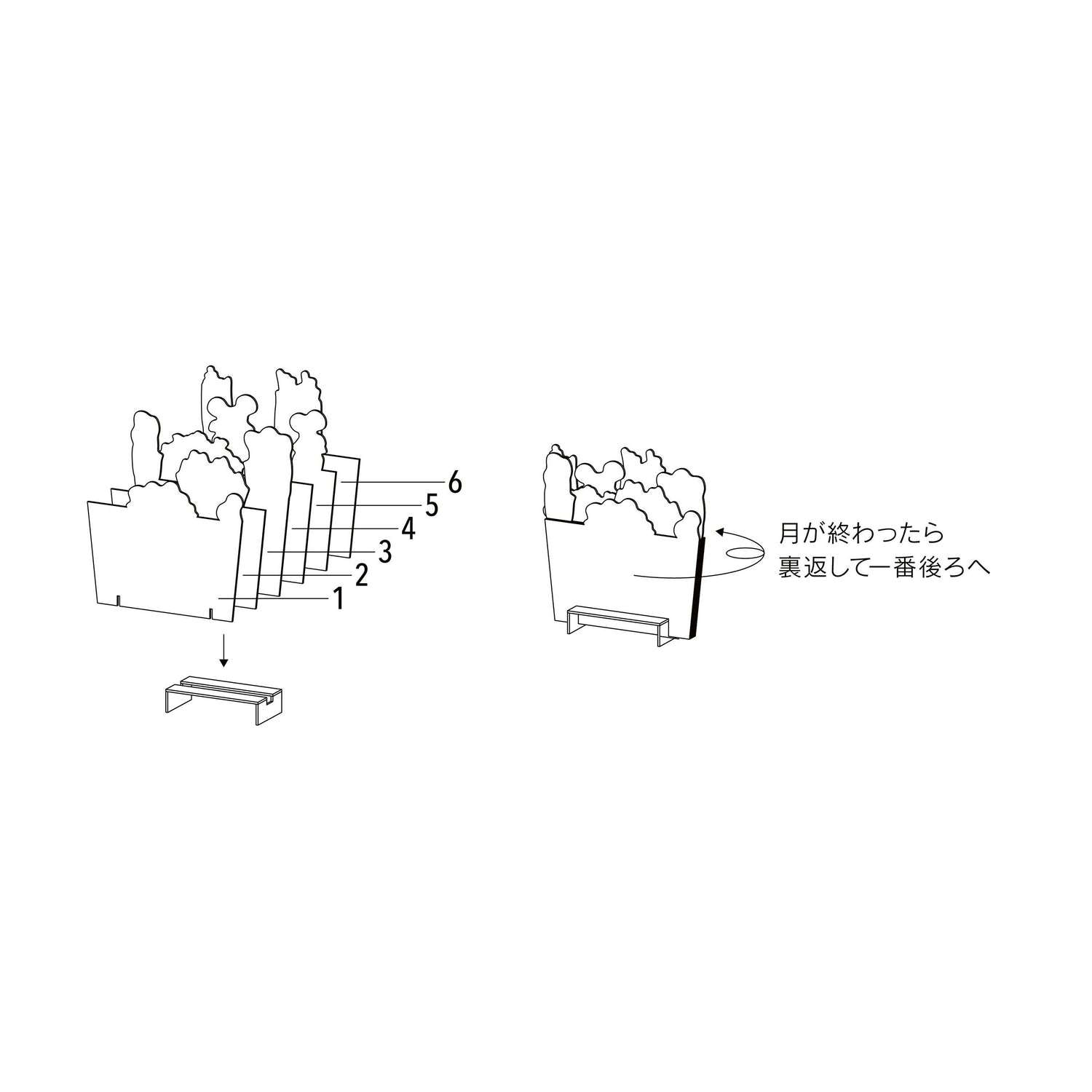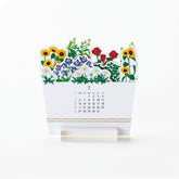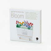 Bloom is a calendar with a design motif of a collection of seasonal flowers arranged in the order of January through June. 6 sheets are stacked on top of each other and set on the base in the order of January through June. At the end of each month, turn them over and turn them to the back.