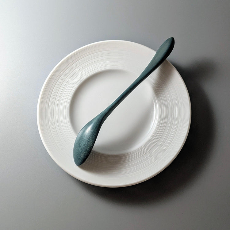 This wooden spoon is finished with lacquer in azure color.