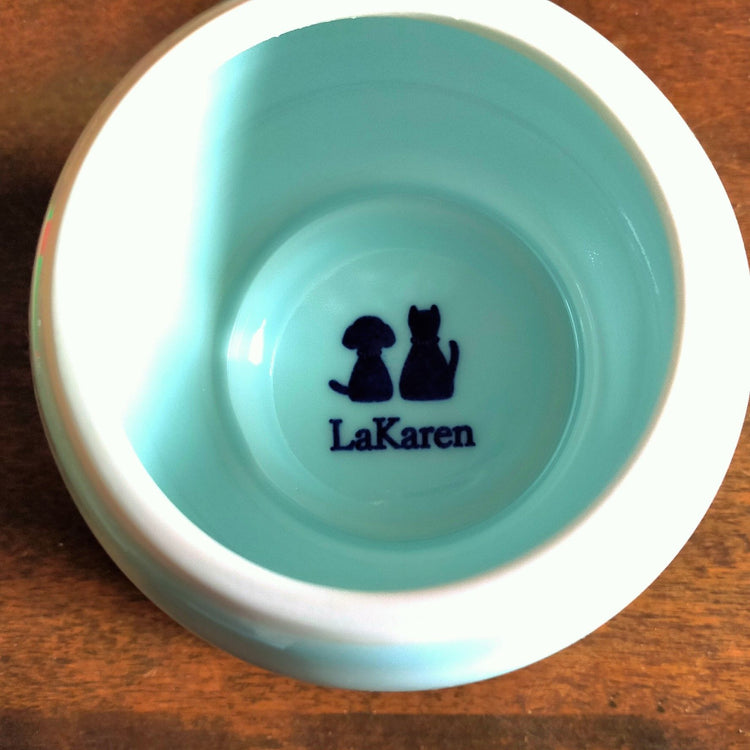 The bottom of the tableware is decorated with the LaKaren logo with a dog and cat motif.