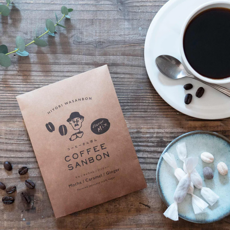 Flavored wasanbon in the shape of coffee beans, perfect with black coffee.