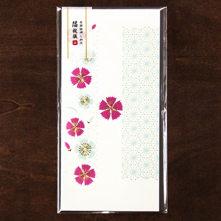 A congratulatory envelope combining a traditional Japanese pattern and lovely Japanese flowers.