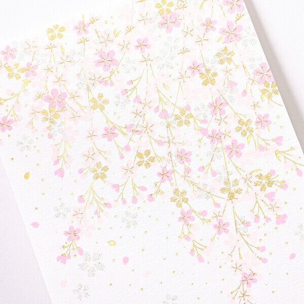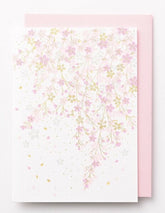 Long-selling card featuring cherry blossoms printed with silk screen, foil stamping, and glitter.