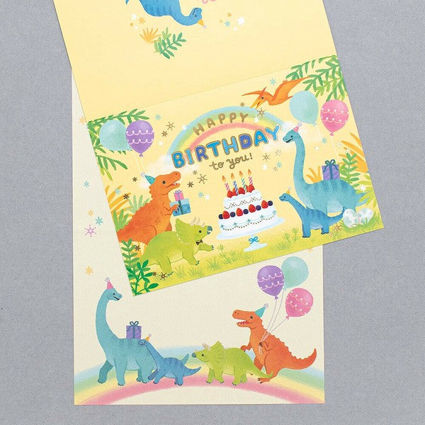 Birthday card illustrated by kazuemon, featuring dinosaurs like Tyrannosaurus, Triceratops, and Pteranodon joyfully gathering with presents for a party. Gold-foil accents add a sparkling touch.