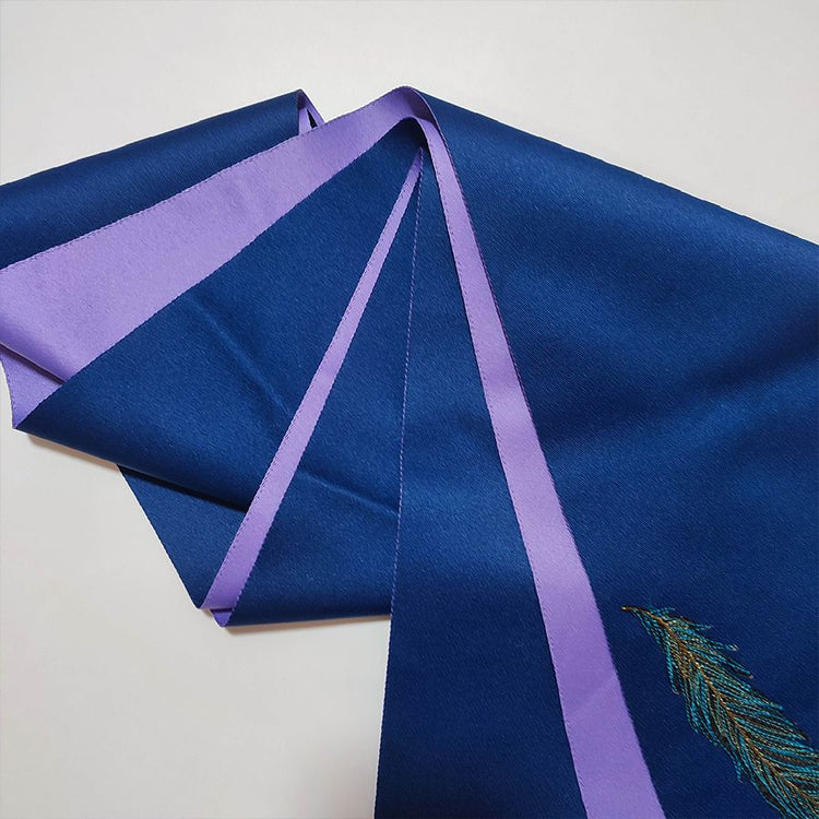 A navy blue and purple half-width obi with an embroidered decoration of blue peacock feathers.