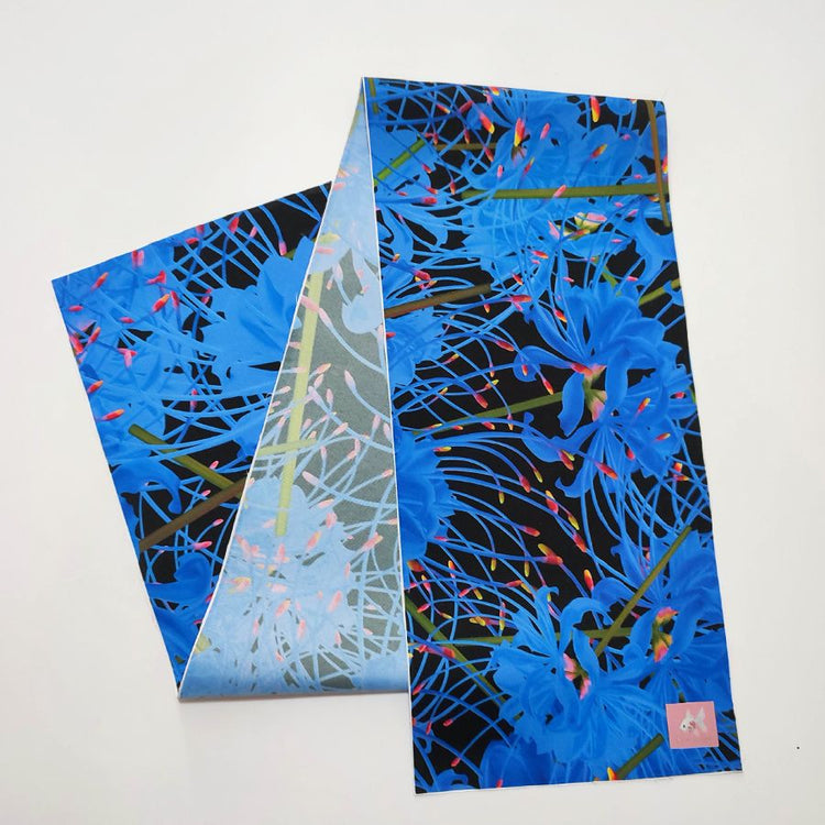 This half collar has a beautiful blue higanbana pattern on a black background.