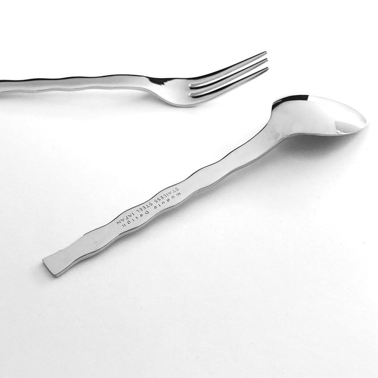 The teaspoon and cake fork are made in small lots by a manufacturing and sales company in Tsubame City, Niigata, Japan, and the wavy lines make them fit your hand and give them a fun design. The mirrored finish is of a remarkable quality. The handle is engraved with the words "Module Design. The packaged set makes a great gift for yourself or a close friend.