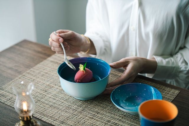 The design is based on the motif of a snowy scene with lights shining through the snow on the trees as seen from a valley in Yamanaka Onsen, Kaga City, Ishikawa Prefecture. The contrasting colors within are larger bowls painted over by hand by spray-painters. The colors are also good for use with Zoni, noodles, ice cream, and other desserts. Microwave-safe (-20°C to 140°C), dishwasher-safe after use, clear coated bowl with lid finished with an antibacterial top coat. Comes in a special cosmetic box.