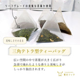 The tea bag is shaped like a triangular tetrahedral mesh type. The tea leaves spread widely in a large space, and the aroma and taste are extracted as if brewed in a kyusu (Japanese teapot). The tea bags are made of plant-derived materials that are environmentally and health-friendly.