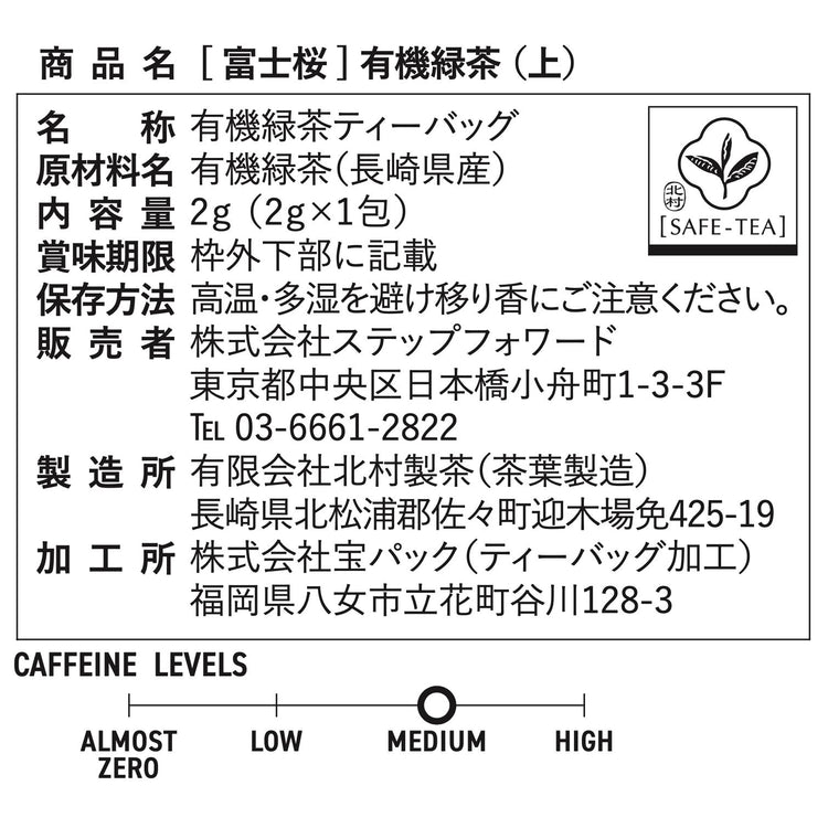 Fujizakura is made from organic tea leaves grown without the use of any pesticides. It is a domestic organic Japanese tea made from tea leaves of Kitamura Seicha, which has been certified as JAS organic in Japan and has passed the strict standards for residual pesticides by the international testing, inspection, and certification organization [SGS], and has received numerous awards including the Medal with Yellow Ribbon.