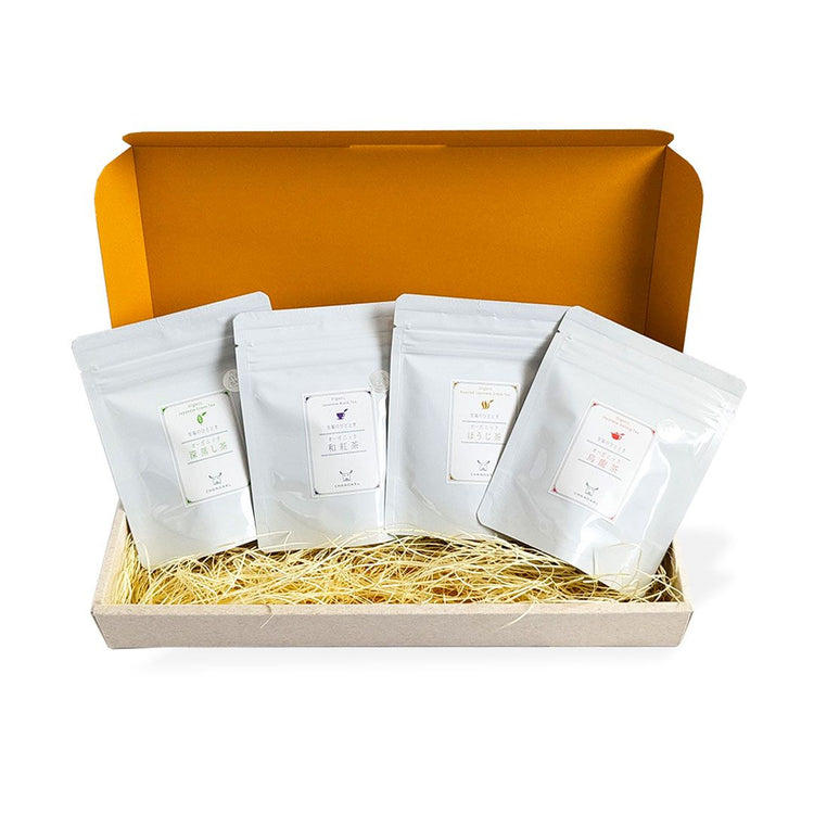 This is a gift set of safe and delicious organic tea bags made from high-quality Japanese organic tea leaves grown without reliance on pesticides or chemical fertilizers. The set includes an assortment of four popular types of tea: deep steamed tea, Japanese black tea, oolong tea, and hojicha.