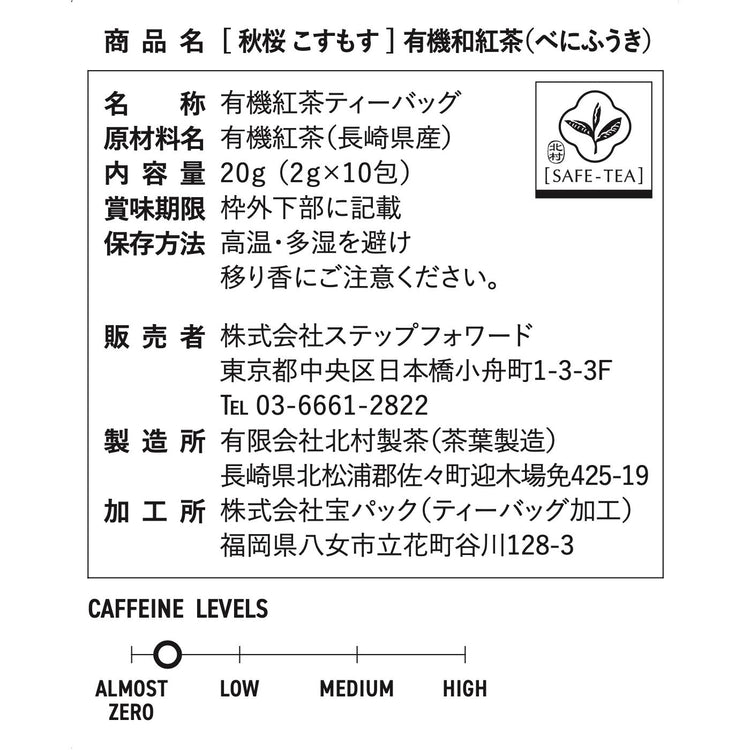 This organic Japanese black tea is made from organic tea leaves of Benifuuki, which is famous as a variety for black tea. Unlike most Japanese black tea, only the first tea leaves are used, so it has a refreshing taste with less acridity and astringency characteristic of black tea.