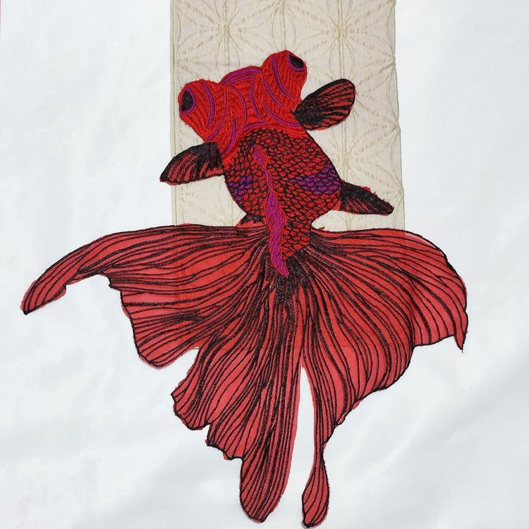 A hemp leaf patterned Hyougo obi with a large embroidered goldfish.