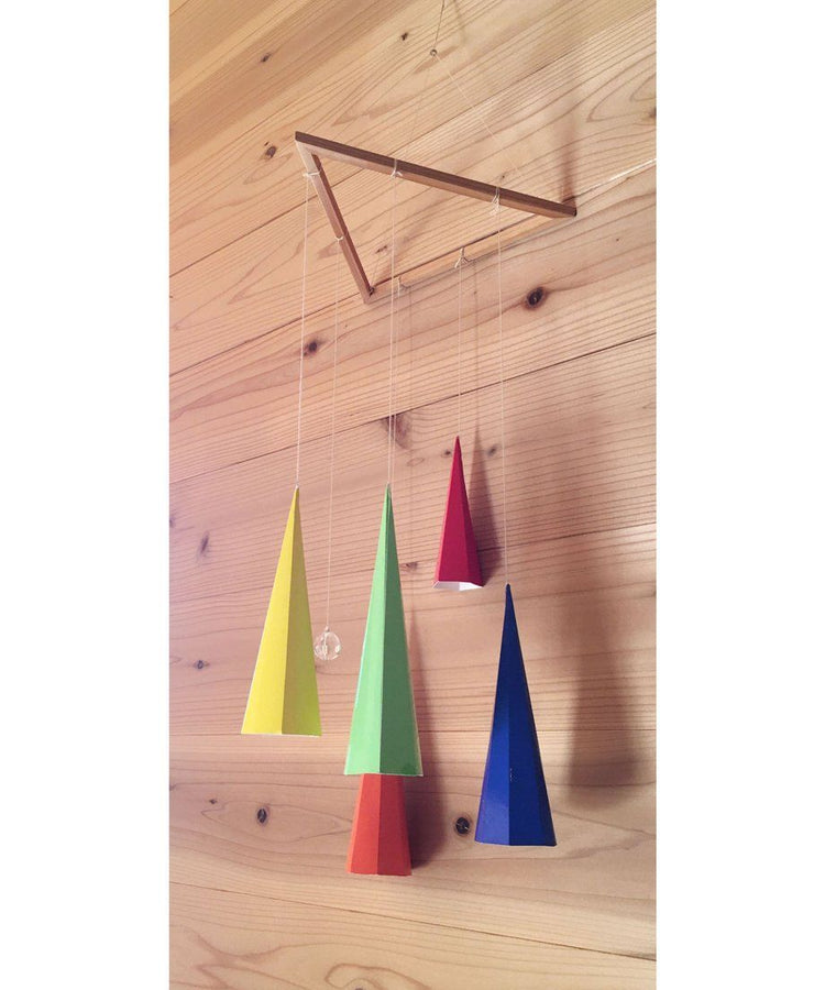 *Triangular pyramid made of paper with thread attached. Adjust the length according to the space where you want to hang it, and tie it to the triangular frame.