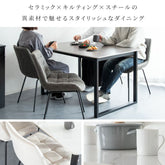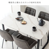 Dining set [Lement] consists of a dining table with a marble-like top made of ceramic and dining chairs quilted in a shape that fits the body.