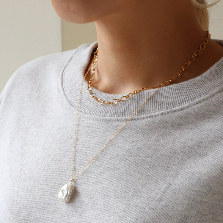 The chain is long enough to be worn around the chest, so you can enjoy layering it as you like.