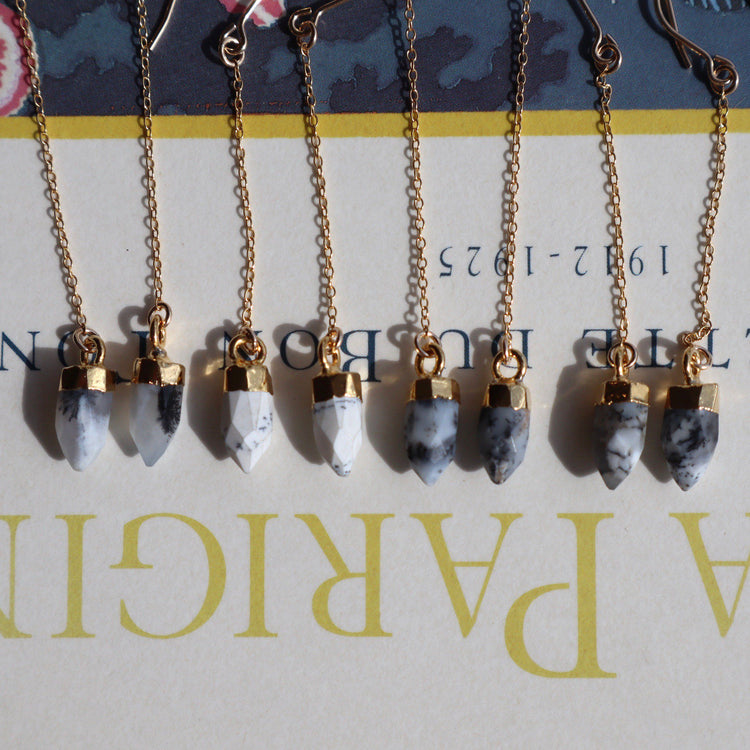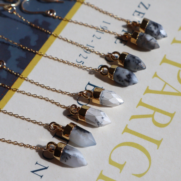 Dendrite opal point charm with a milky white color and dendritic black pattern.